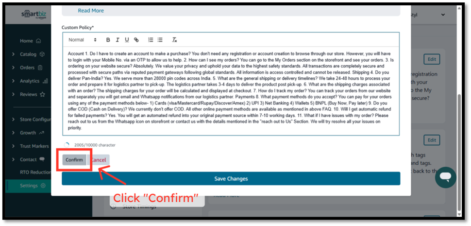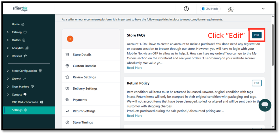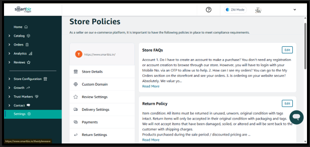 Store policies are required for compliance and to enable online payments on your SmartBiz store.