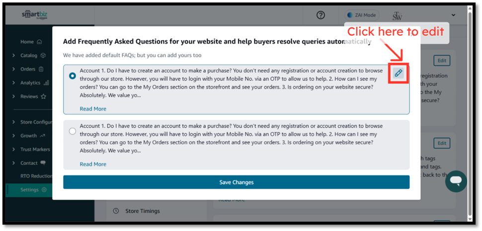 Click Edit on the policy you want to update (for example, Returns or Cancellations).