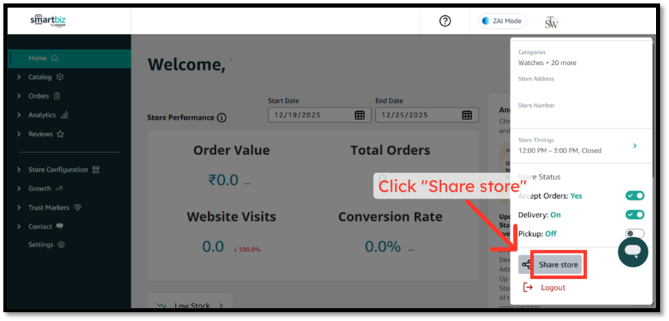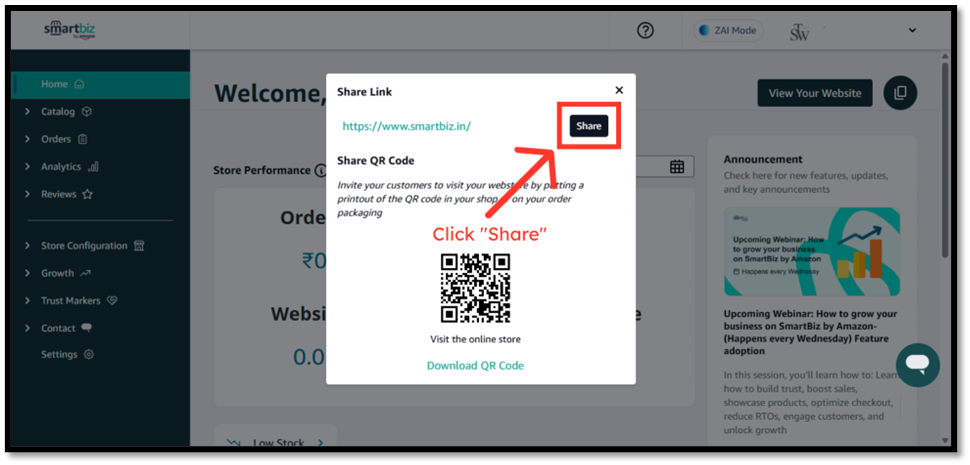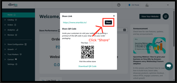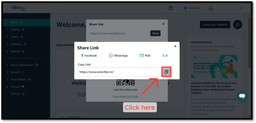 QR Code: Customers can scan the QR code to open your store instantly. You can download and share this QR code on social media, chat platforms like WhatsApp, or display it inside your physical stor