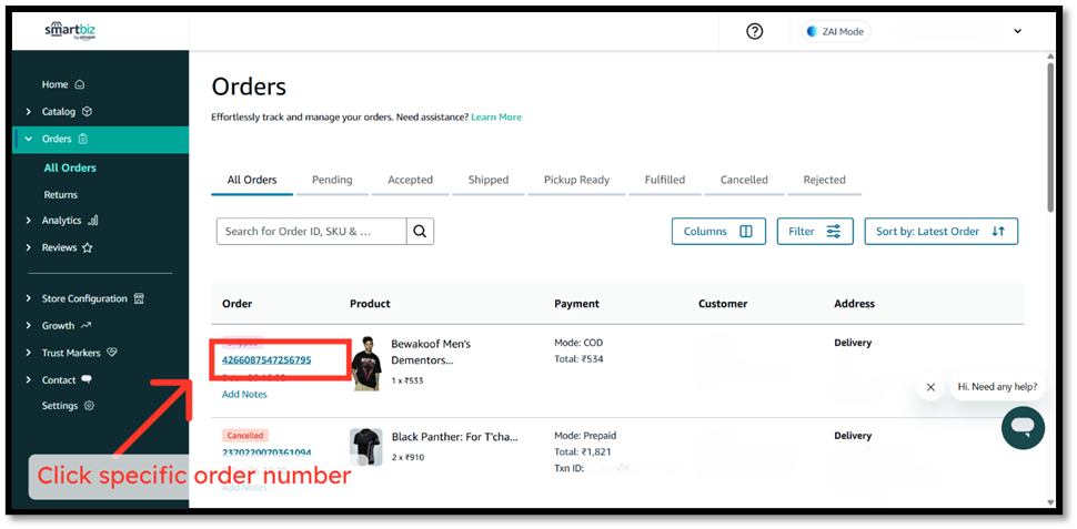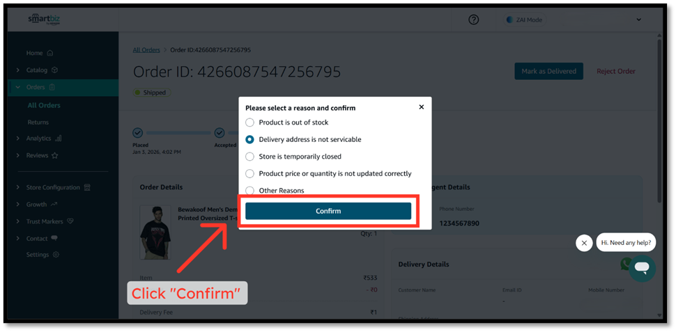 You may need to cancel or reject an order for various reasons, such as the product being out of stock, the delivery address being unserviceable, or the store being temporarily closed. This article explains how you can cancel or reject an order on SmartBiz by Amazon.