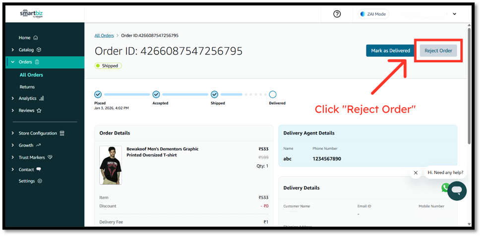 - Click on the ‘Reject Order’ button.