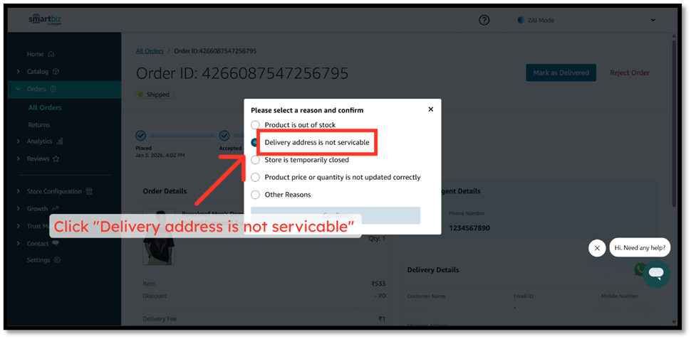 Click the appropriate option indicating the reason for rejecting the order, in this case "Delivery address is not servicable".