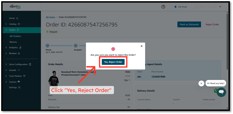- Confirm by clicking ‘Yes, Reject Order’ if you want to reject the order.