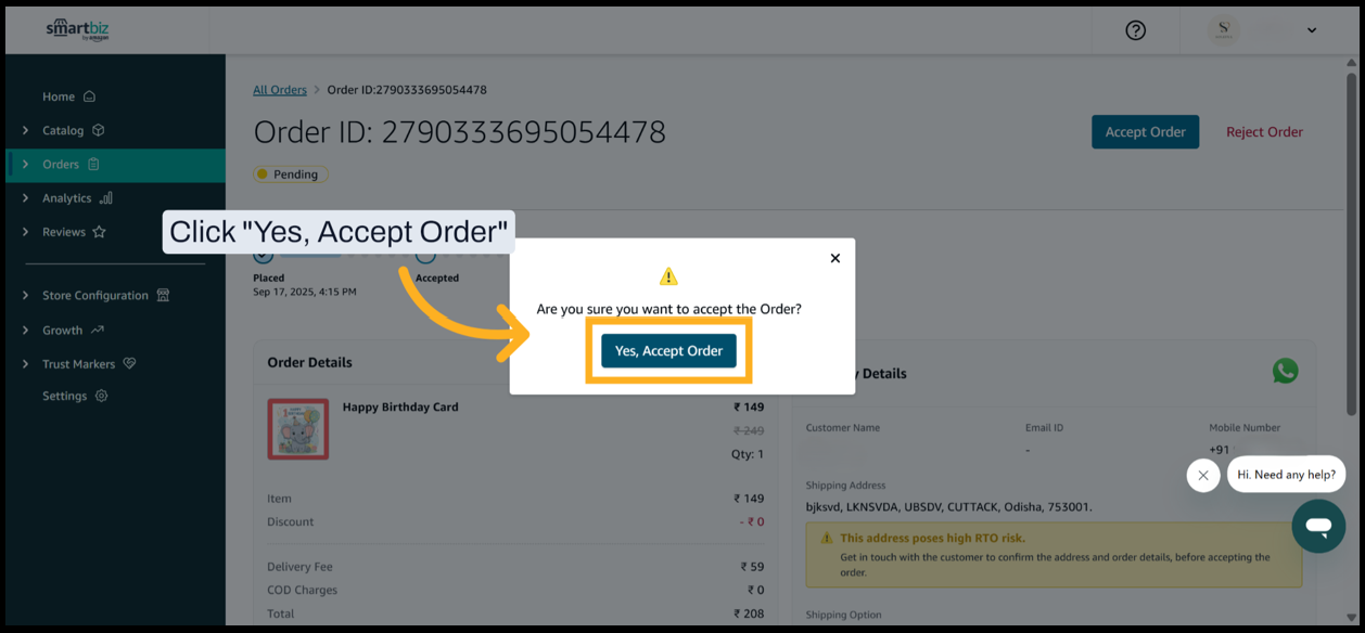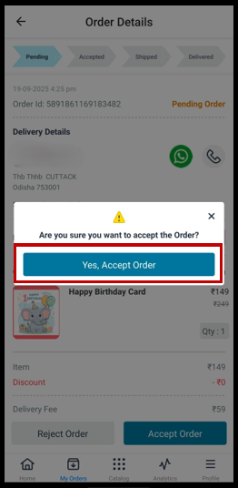 4. Click Yes, Accept Order to finalize acceptance of the order.