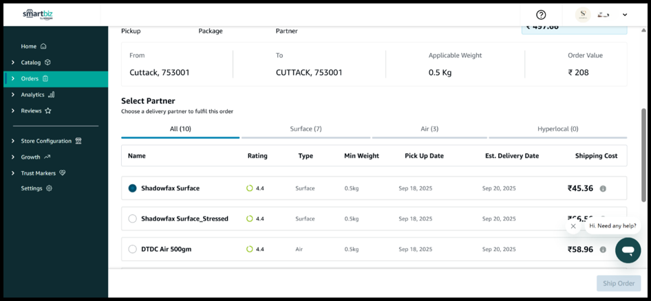 12. Click the courier selection area to choose a desired delivery partner to ship the order. Depending on your parcel dimensions and delivery pick up/ drop pin codes, you will be shown a list of courier partners. You can select a courier partner depending on your budget and the carrier's rating.