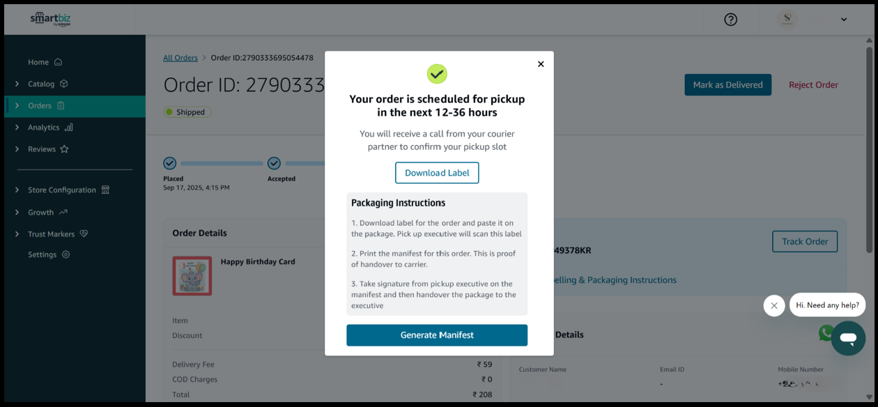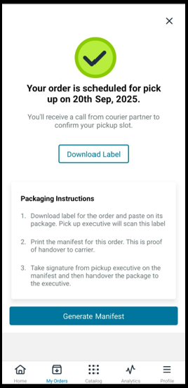 10. You will receive a confirmation message to review pickup and label instructions. The courier partner will get in touch with you to confirm the pickup slot.