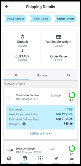9. Depending on your parcel dimensions and delivery pick up/ drop pin codes, you will be shown a list of courier partners. You can select a courier partner depending on your budget and the carrier's rating.