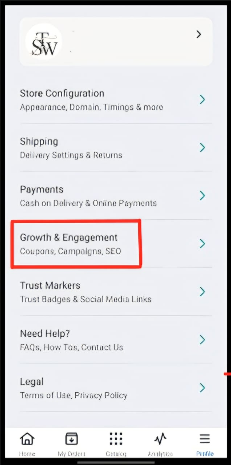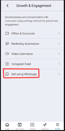 Go to ‘My Profile’ tab on your home page and click on 'Growth and Engagements' and then on 'Sell Using Whatsapp'