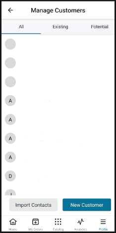 - Potential Tab – You will see contacts of all potential customers, who have not placed any order with the storefront yet. You can build this list by adding contacts 1x1 or by importing them in bulk from your phone book.