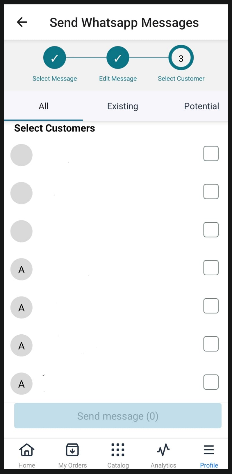 - Lastly, select the customers who you want to share the message with. You may use the ‘Existing tab’ to target already existing customers and potential tab to select new customers.