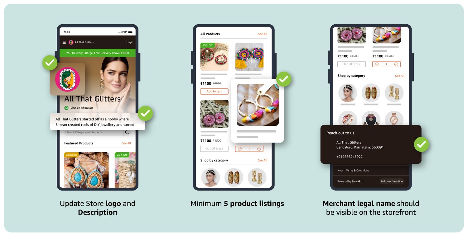• Product Listings: A minimum of 5 live product listings is mandatory.