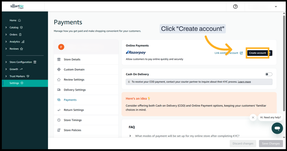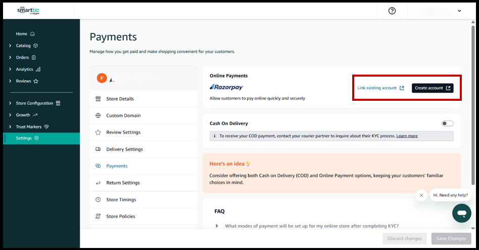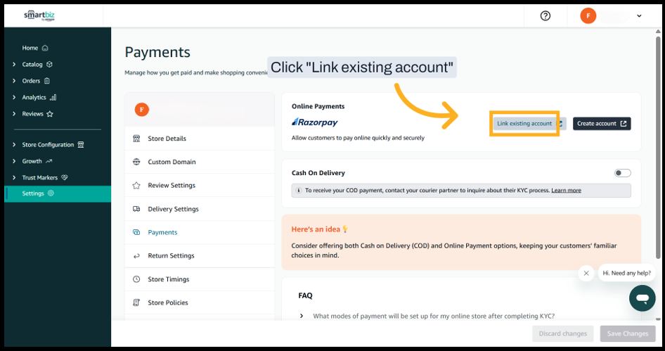 1. You can use your existing Razorpay account to integrate with SmartBiz account. Click on "Link Existing account".
