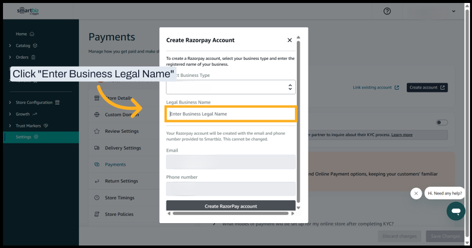 c) Now enter a Legal Business Name and the registered email address along with the registered phone number on your SmartBiz account will automatically populate under Email and Phone number section.