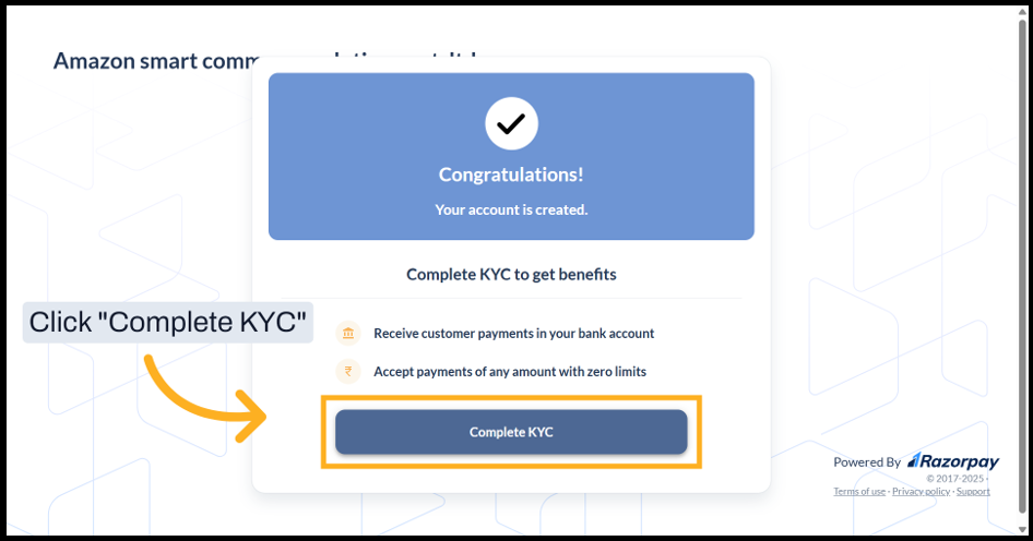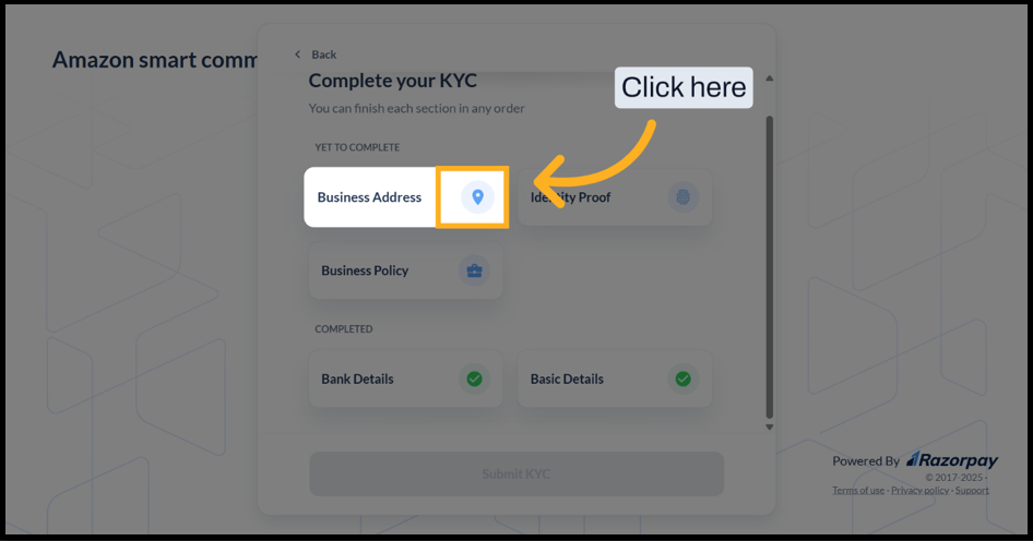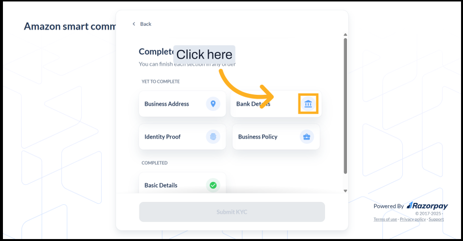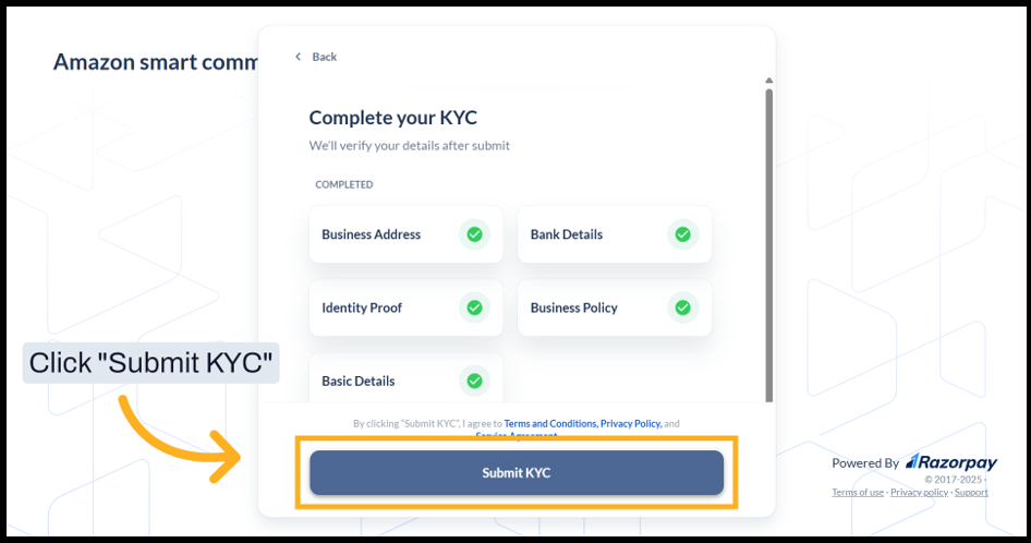 Your KYC submission is now complete and under review. Once verified, you will be able to receive orders and payments through your linked Razorpay account. To monitor the verification status, log in to your Razorpay dashboard.