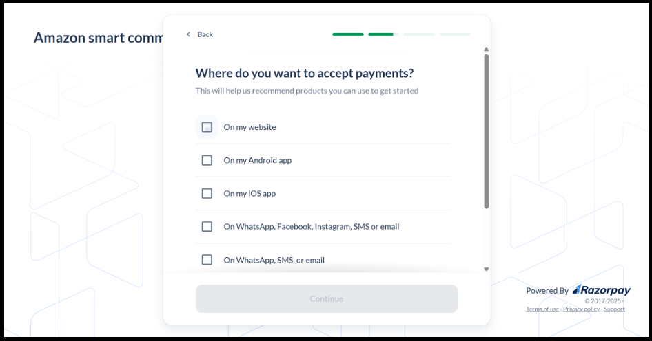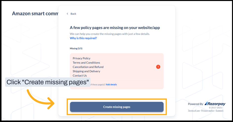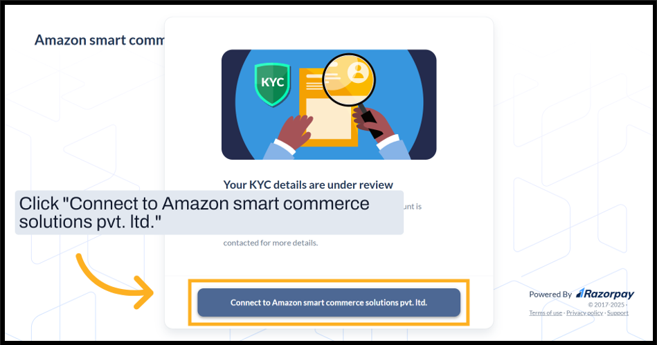 36. Click Connect to Amazon smart commerce solutions pvt. ltd. to link your Razorpay account with Amazon's commerce platform, facilitating seamless payment processing.