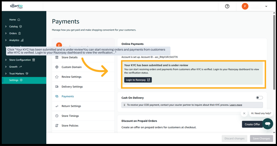 To activate online payment methods such as cards, UPI, net banking and wallets on your SmartBiz website, it is imperative to undergo KYC verification with Razorpay.