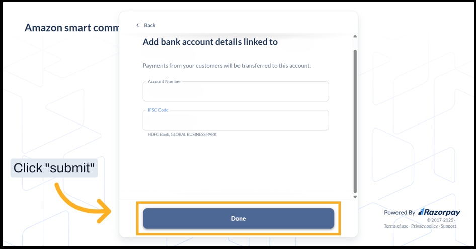 11. You will be required to fill in "Bank details" which you wish to be associated with your Razorpay account.