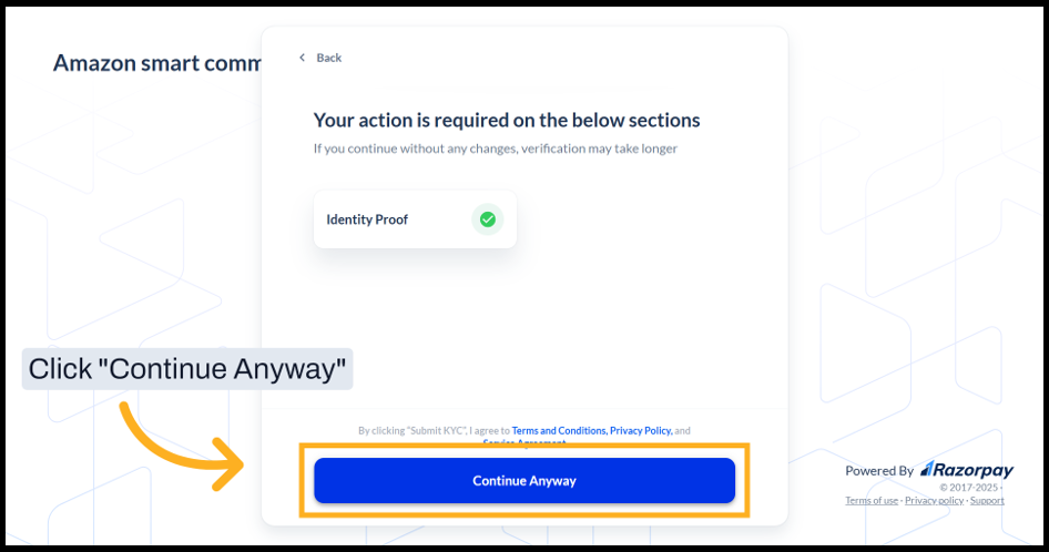 35. Click Continue Anyway to proceed, allowing you to move forward with the KYC submission.