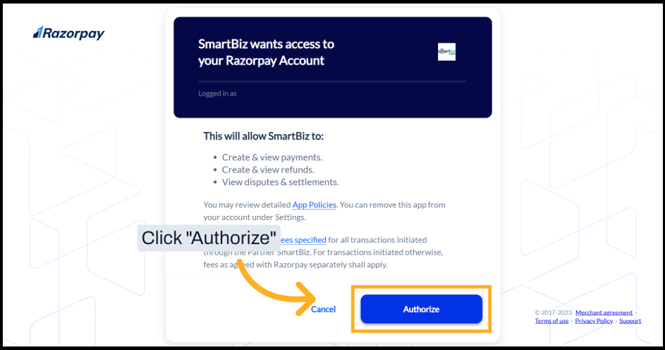 8. Click the “Authorize” button to connect the Razorpay account with SmartBiz.