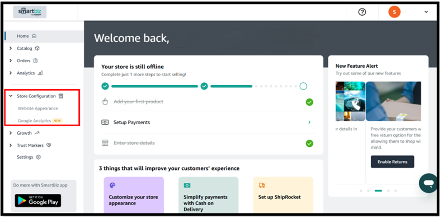 Step 1: Click on the GA card in the new features card shown on the Home page OR Go to Profile > Store Configuration > Google Analytics.
