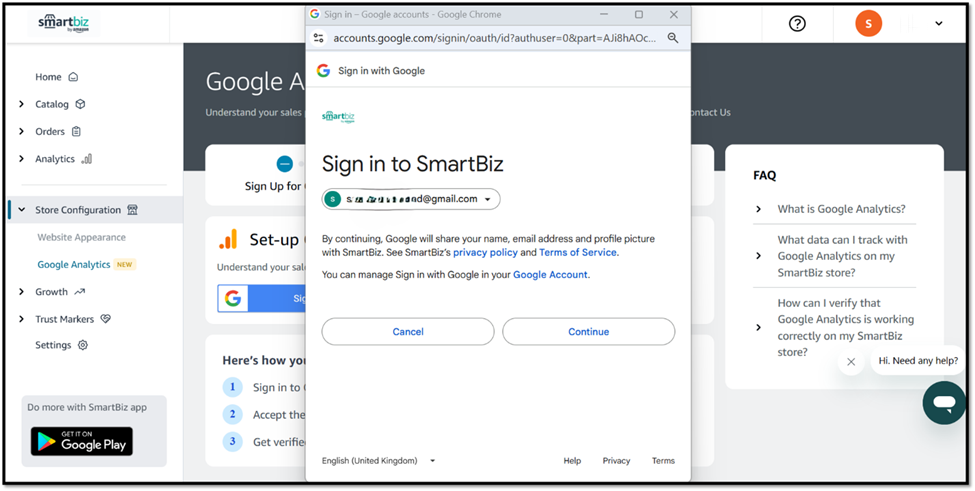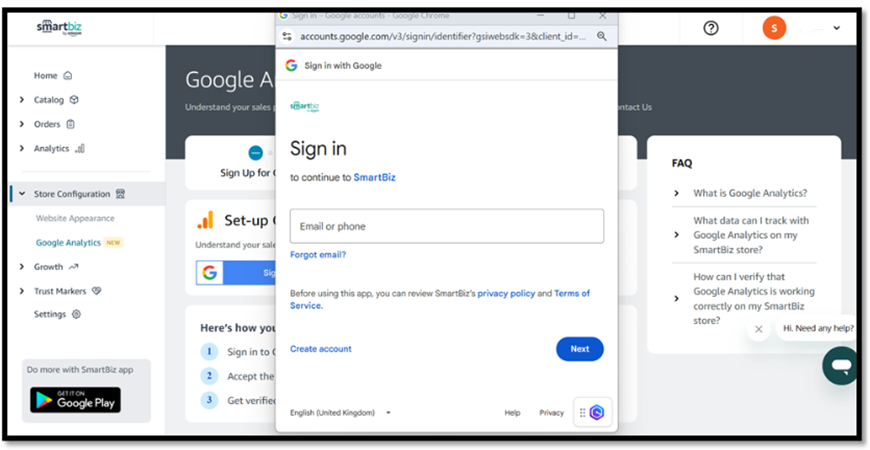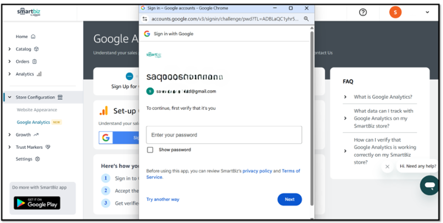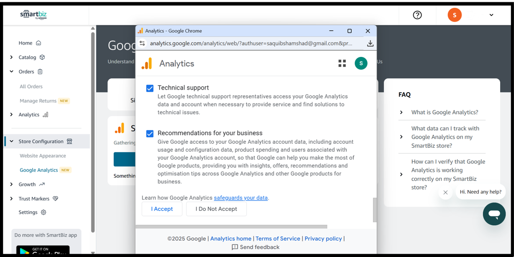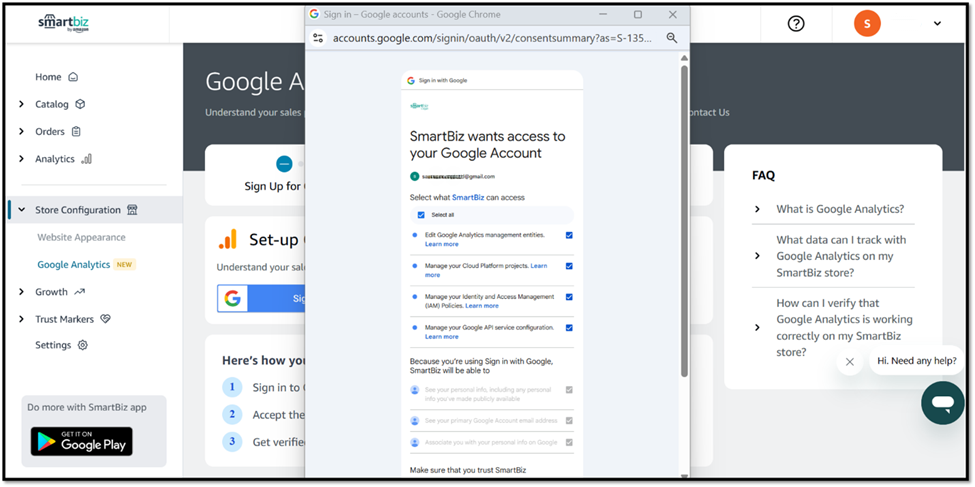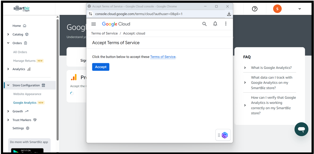 This is required because SmartBiz needs permission to link your Google account with your website data. Without accepting the permissions and Terms of Service, Analytics setup cannot complete.