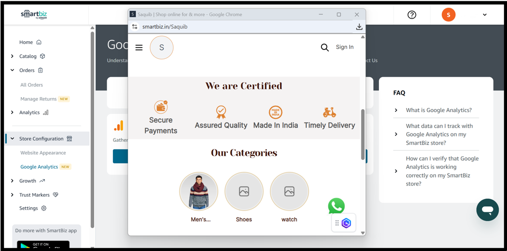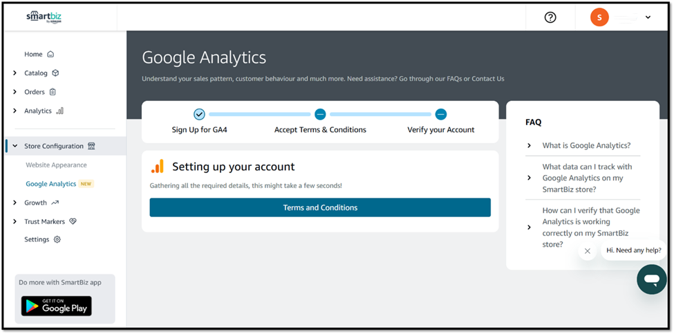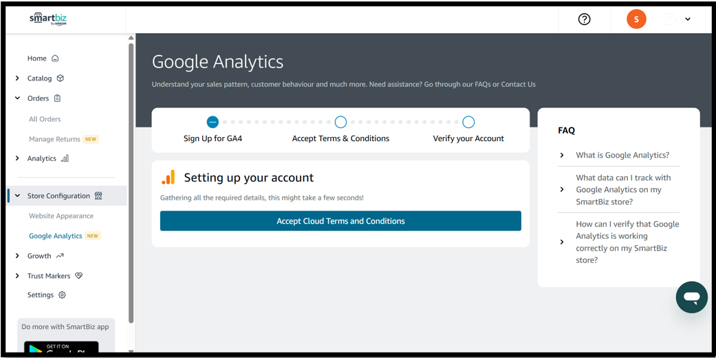 Step 7: After you click Continue, we will start creating a Google Analytics account for your website. You will be redirected to the SmartBiz by Amazon website for 5 seconds. Post this, you will land back on the app for next steps