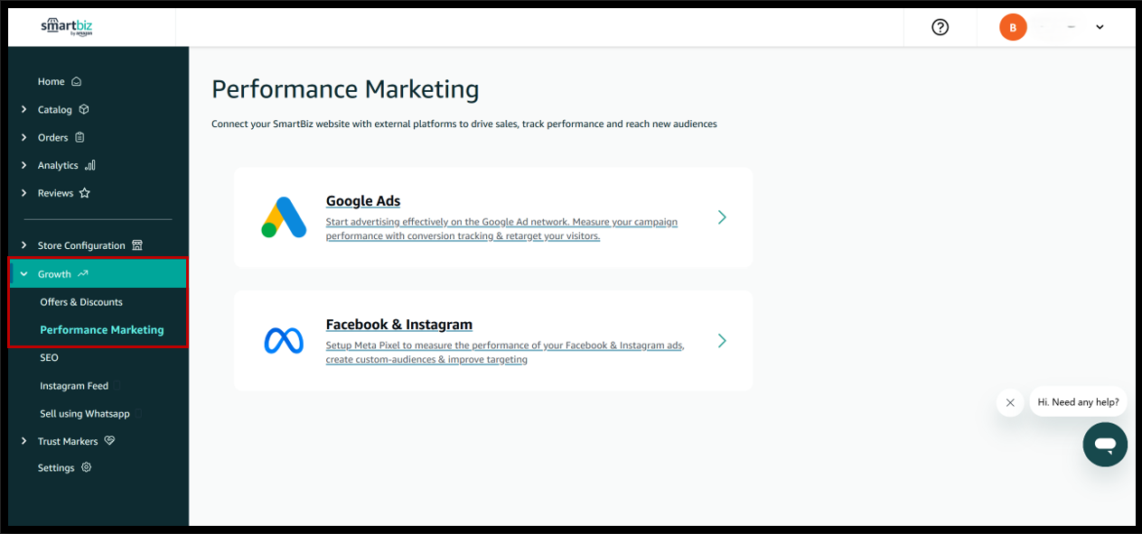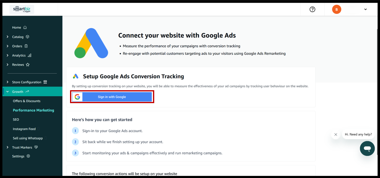 - Open the SmartBiz Desktop App and navigate to the ‘Performance marketing’ tab under ‘Growth’ section on your sidebar and Select Google Ads.