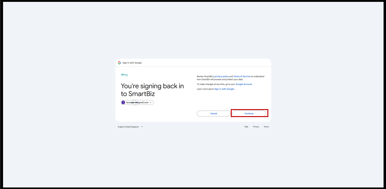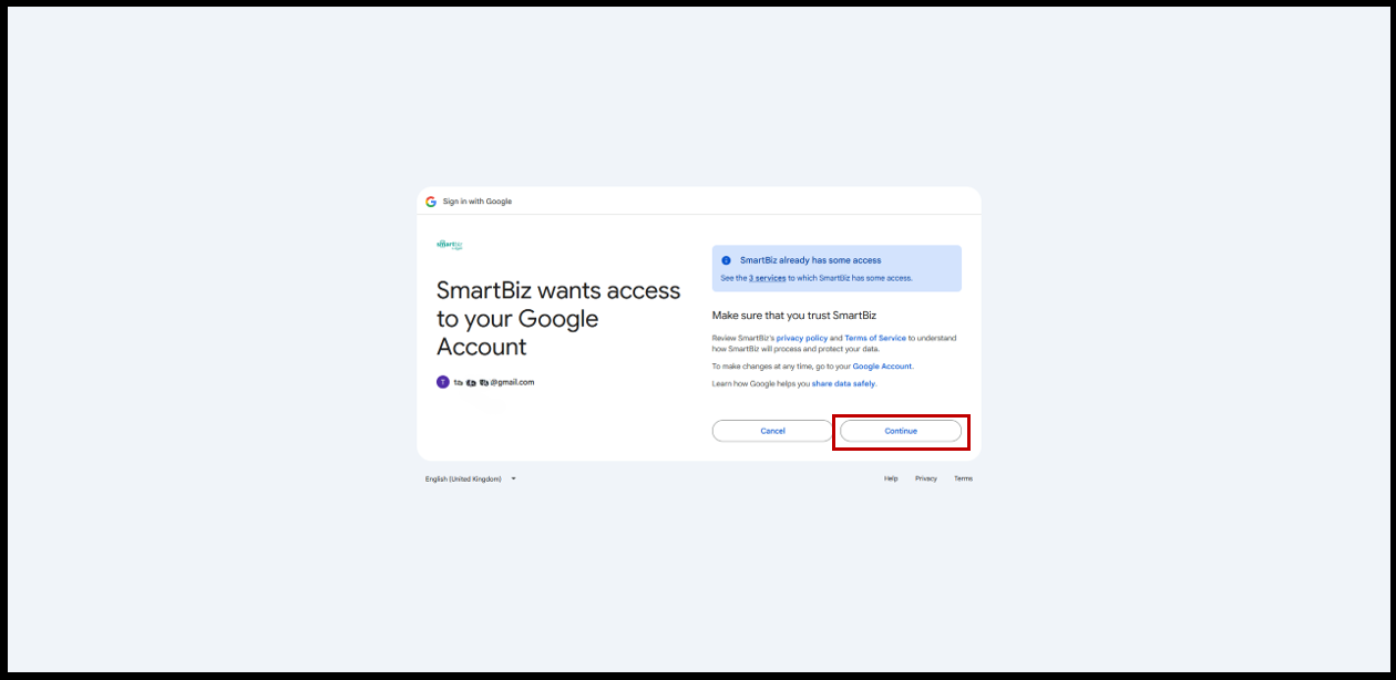 - You will get a prompt ‘SmartBiz wants to access your Google account’. If you have already given permissions to SmartBiz, click ‘Continue’. If you have not given permission to SmartBiz, select the permissions checkbox and click ‘Continue’.