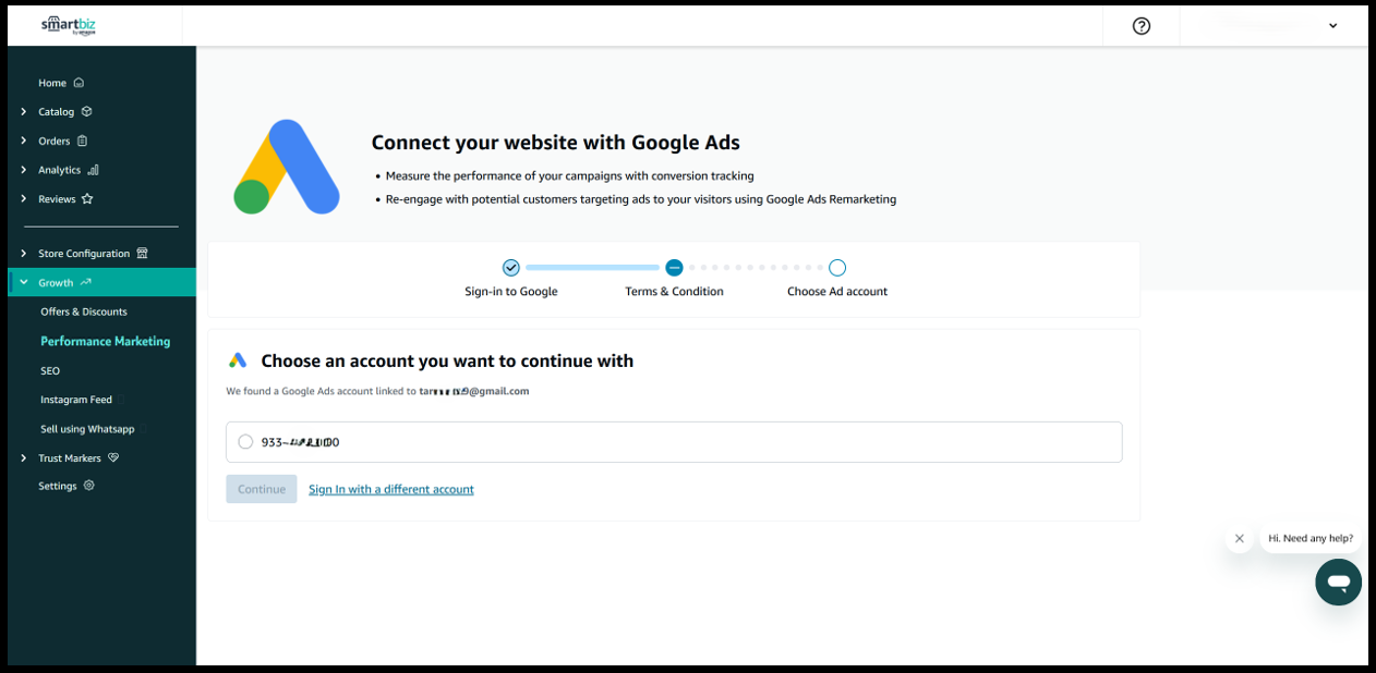 - After successful authorization, you will be re-directed back to SmartBiz with your Google Ads account id displayed. Choose the desired Ad Id you want to link and click ‘Continue’. In case you want to use a different Google Ads account, click on ‘Sign In with a different account