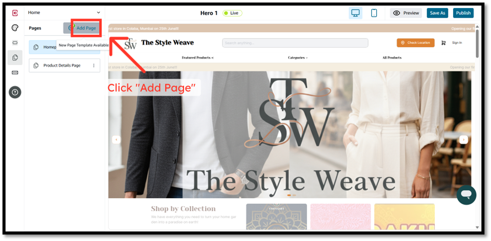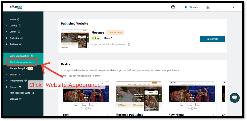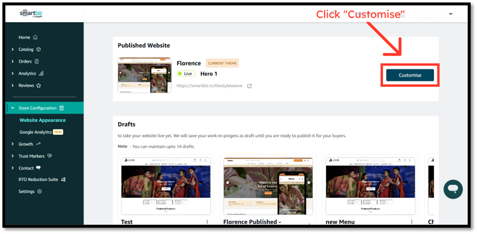 1. Click on 'Store Configuration' and then click on 'Website appearance. Then click on 'Customize'