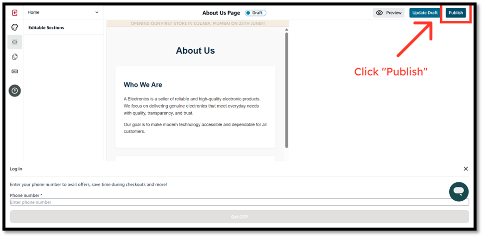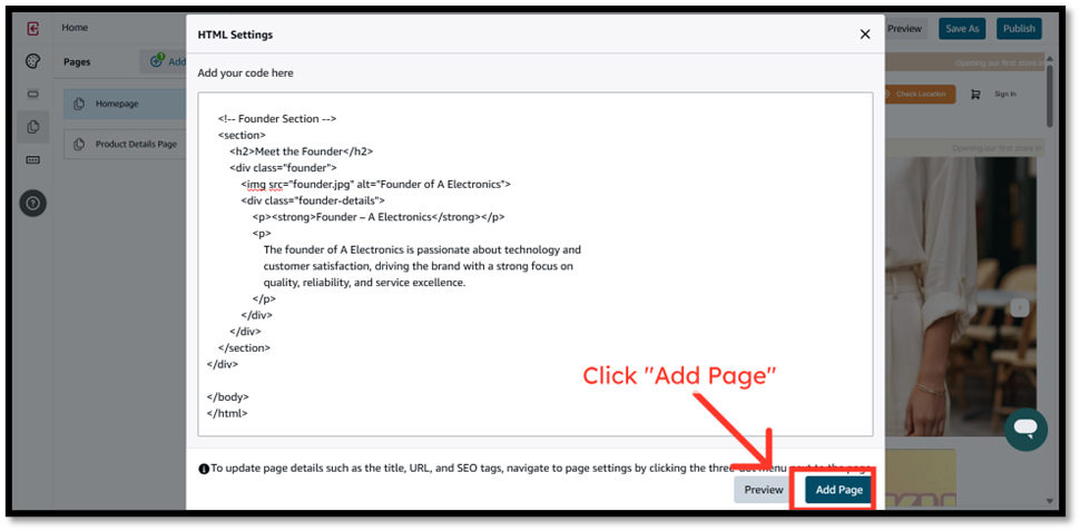 5. Clicking on Add pages with HTML, it will open a new pop-up screen asking for HTML code. You can use any AI tool to generate your HTML code. For example, use any AI tool with a prompt: "Create HTML code for 'About Us' section page for a seller named 'A' who sells electronics. It must have sections for About Us, Our Journey and images of 1 founder.". Paste the HTML code in the page and click on Add Page.