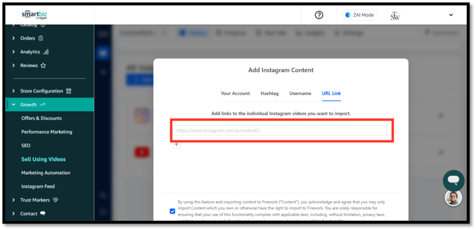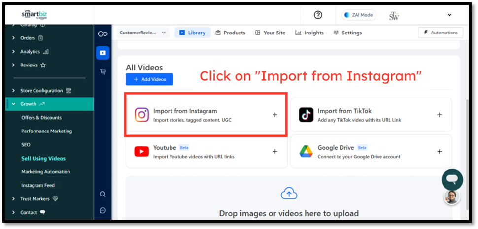 Step 1 — Click “Sell Using Videos” → Import from Instagram