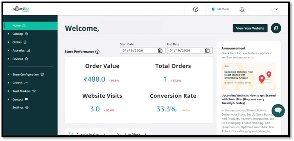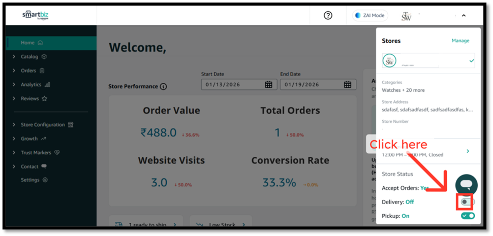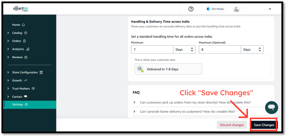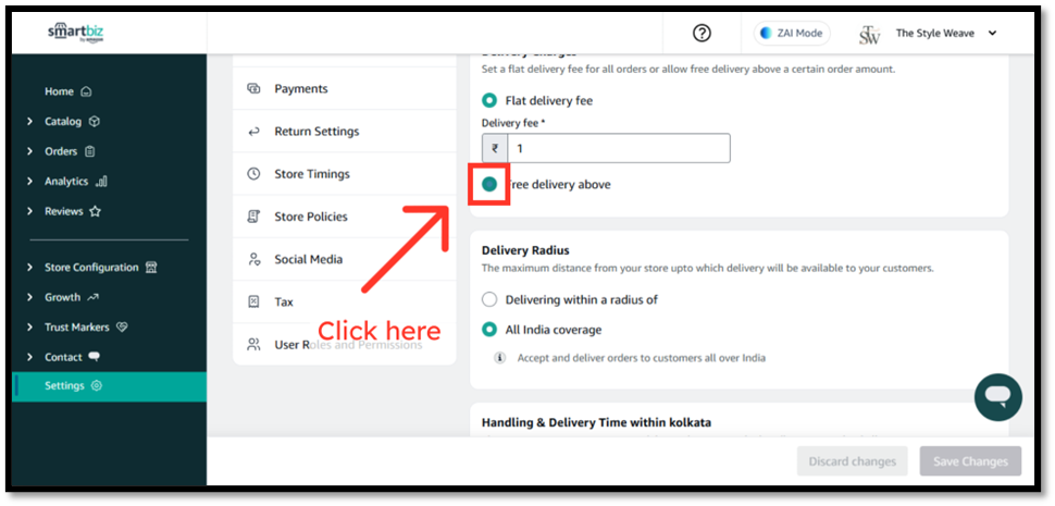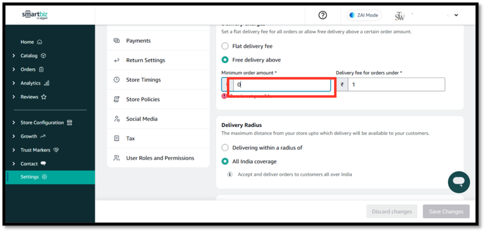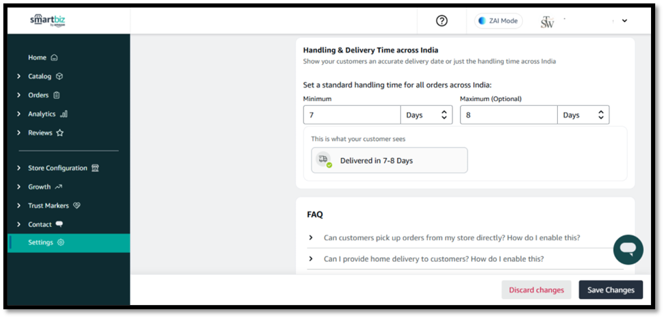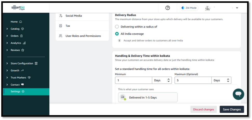 Delivery settings allow you to control how, where, and at what cost orders are delivered from your SmartBiz store. By configuring delivery charges, delivery coverage, and delivery timelines, you can set clear expectations for customers, reduce order-related queries, and optimize your fulfillment operations.