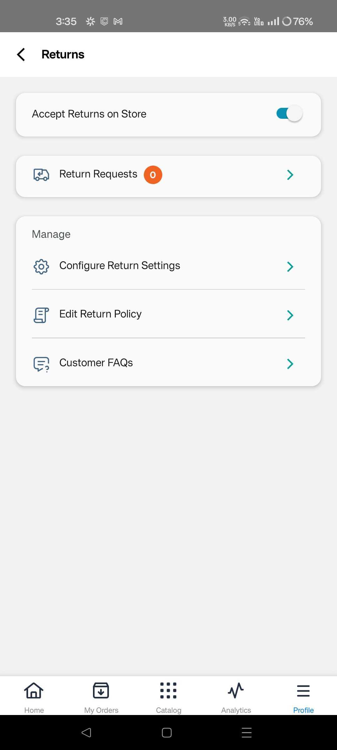 For existing users, click on the toggle button ‘Accept Returns on Store’ to enable returns on your website. You can use the toggle button to ‘disable’ returns anytime.