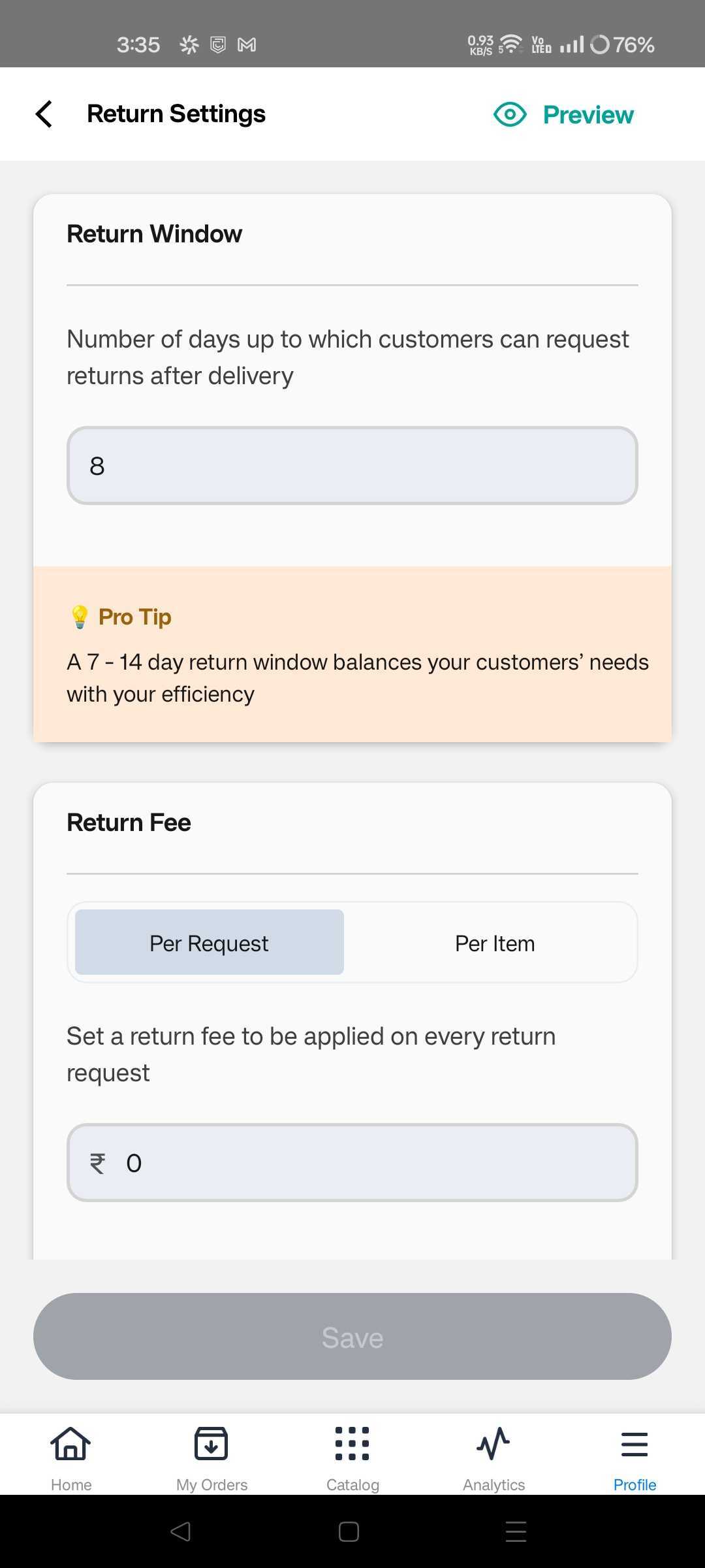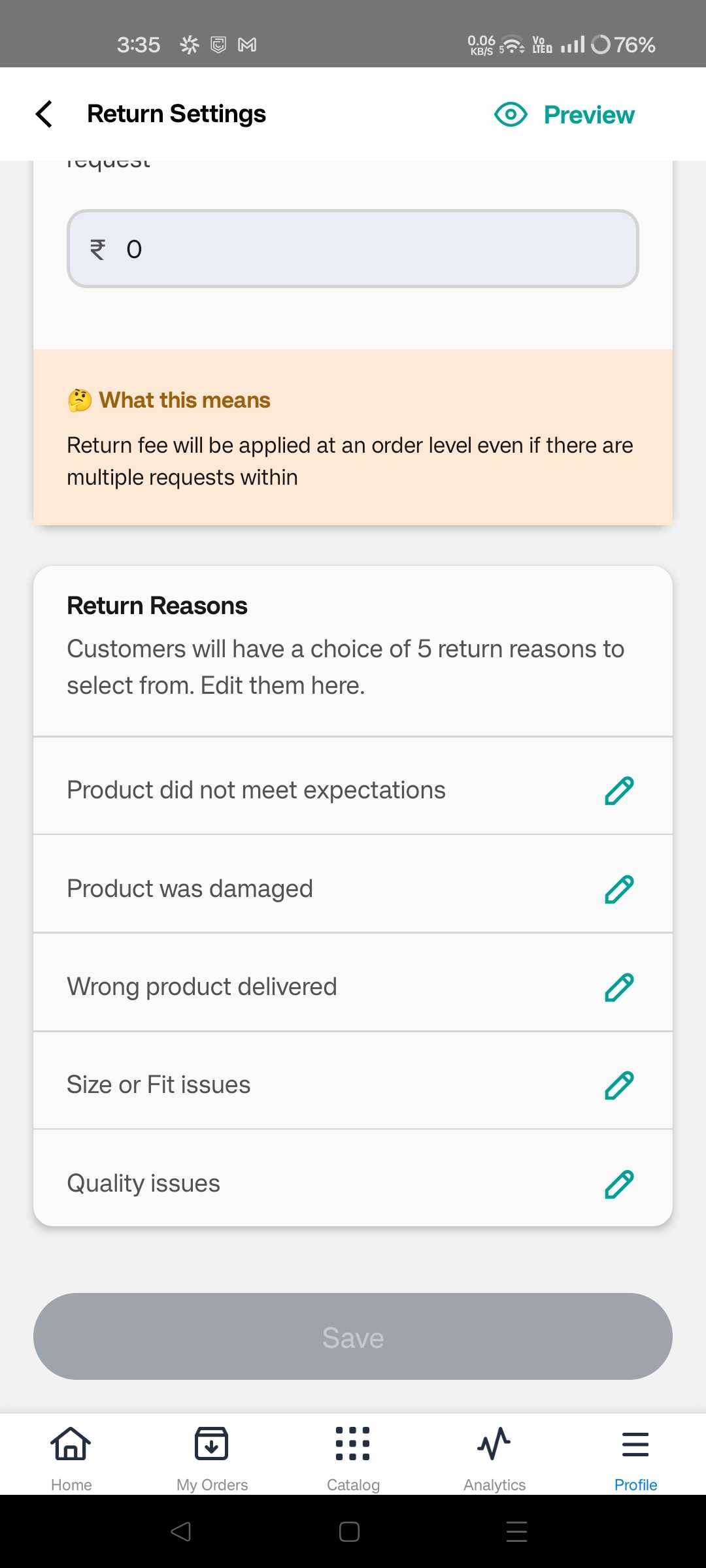 You can edit the return window, fee or reasons at any time by clicking on ‘return settings’ in the settings page. Please note that while new settings will be visible to your customers immediately, the return window applicable will be as per the window when the order was place. This means, if return window was 10 days when the order was placed but has been changed to 5 days when a customer is creating the return request, then the customer will see a return eligibility of 10 days for that order.