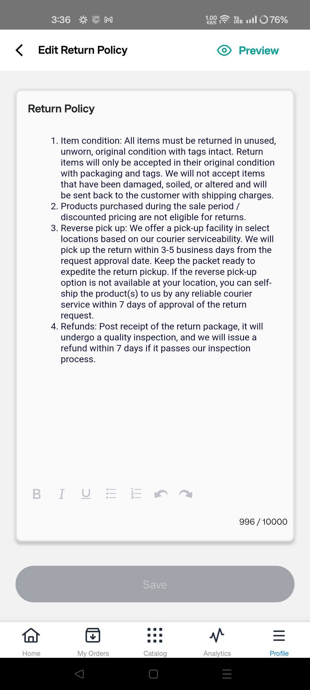 - You can preview the store policy by clicking on the ‘store preview’ button on the top right of the mobile screen.