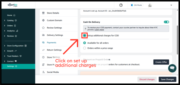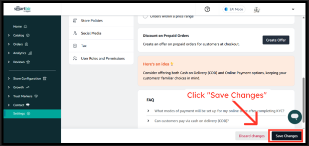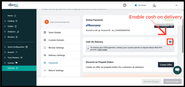 Once enabled, customers can start placing COD orders on your storefront. To receive COD payments, you must complete KYC and bank verification with Shiprocket, SmartBiz’s COD service partner.