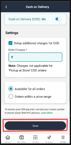 Toggle Cash on Delivery (COD) to ON.