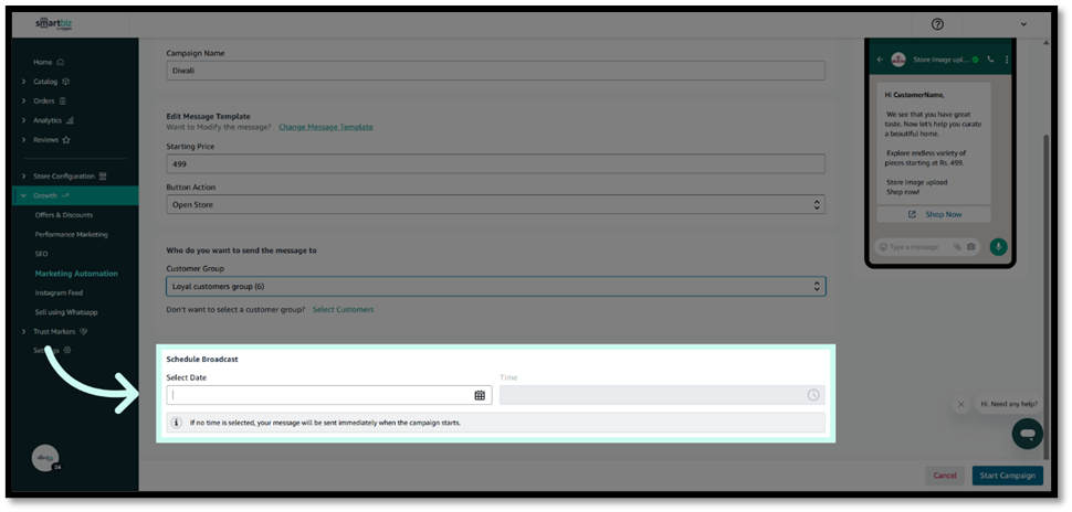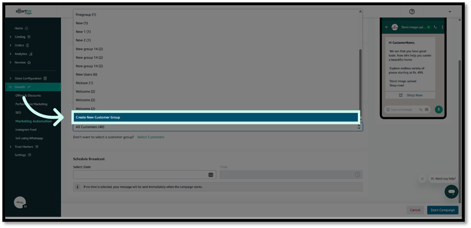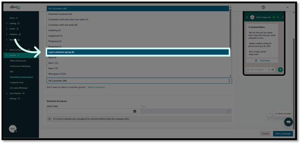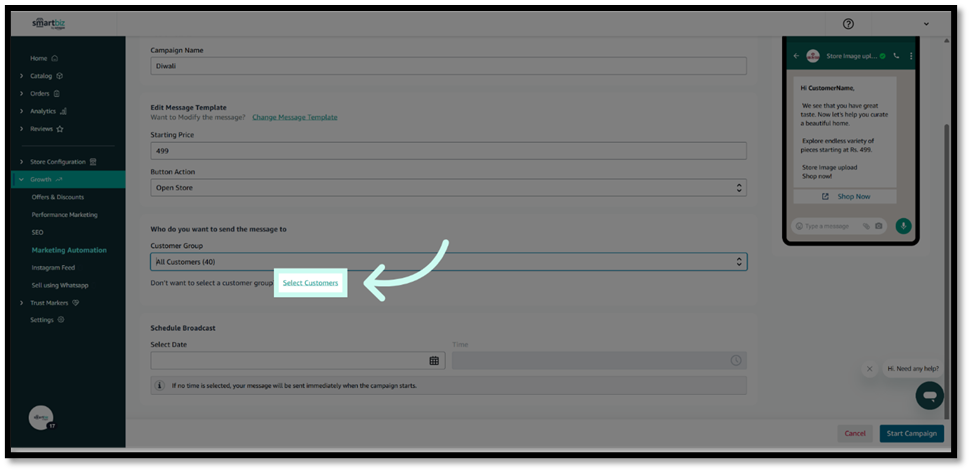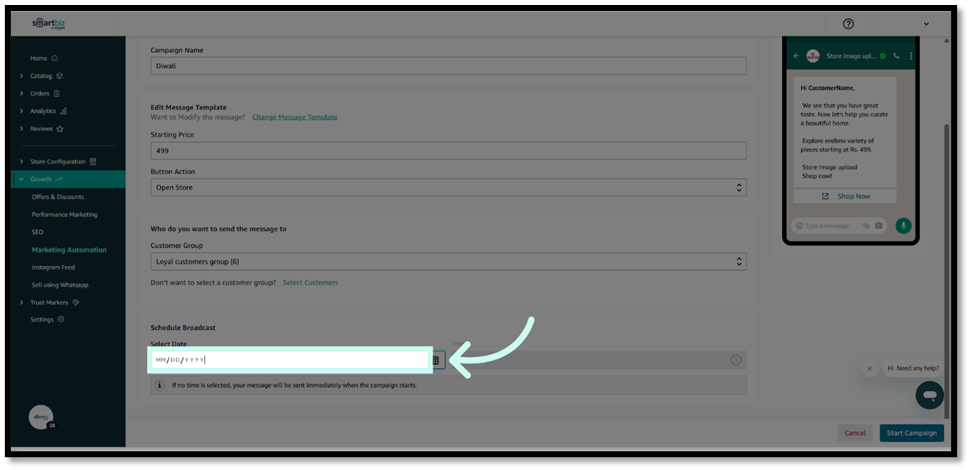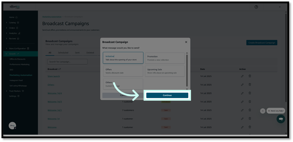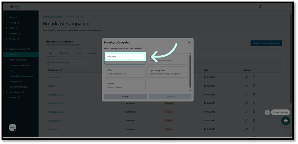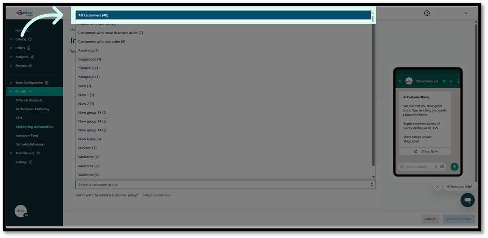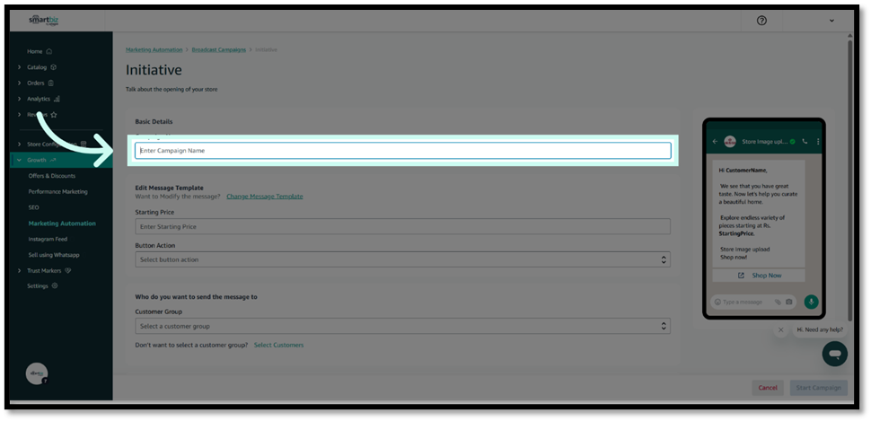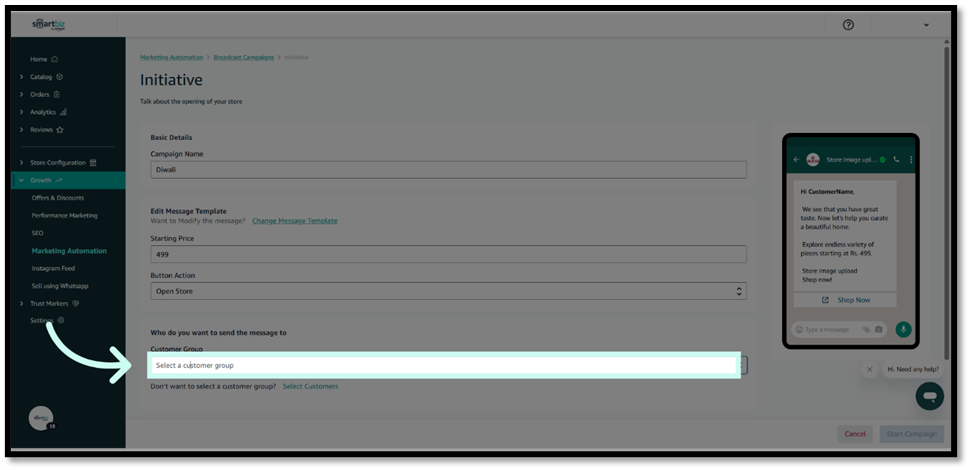 Define your marketing initiative, ensuring it aligns with your business goals and resonates with your target audience. You can choose from some pre-defined objectives such as Store launch, sending offer, announcing upcoming sale, promote a new collection etc. If required, you can create a custom objective also.