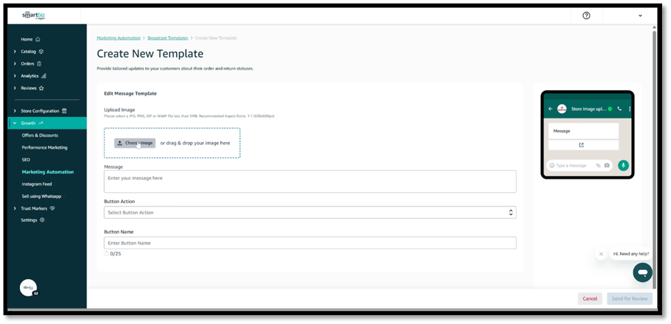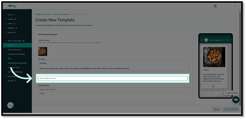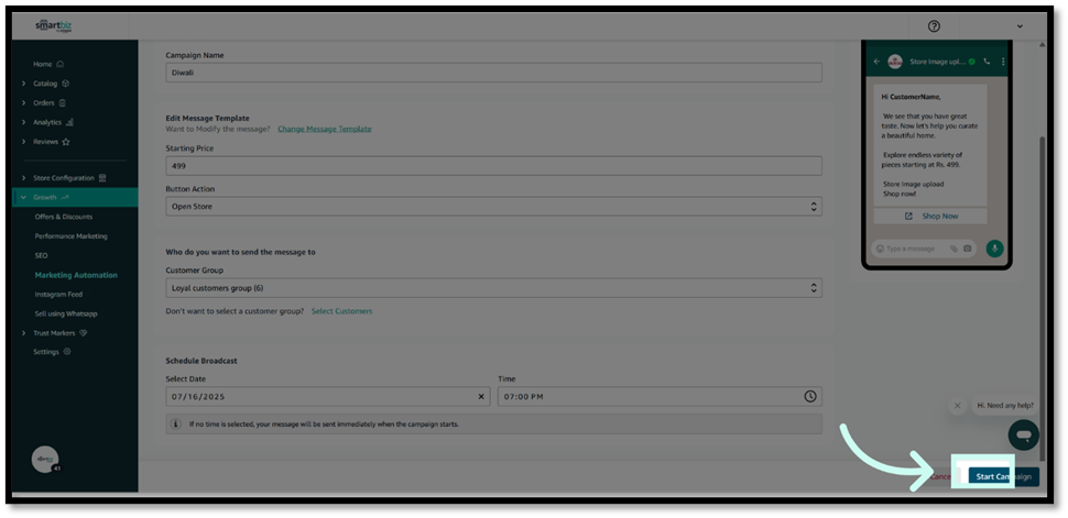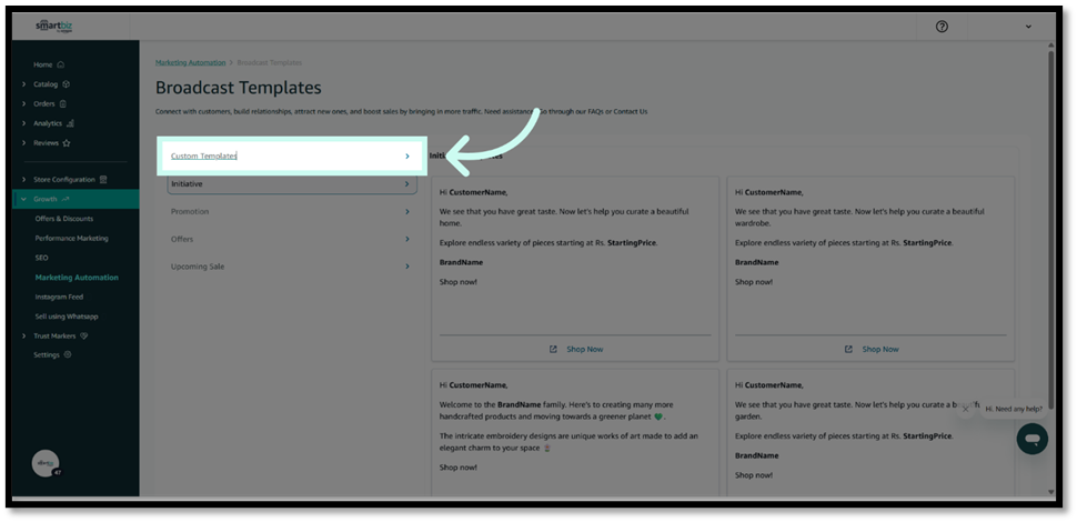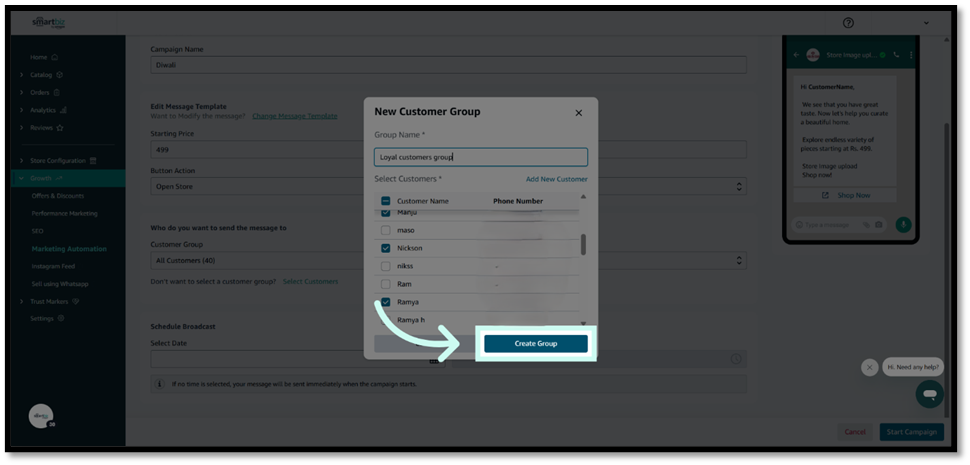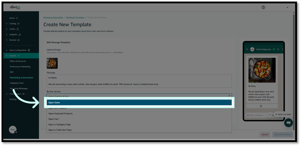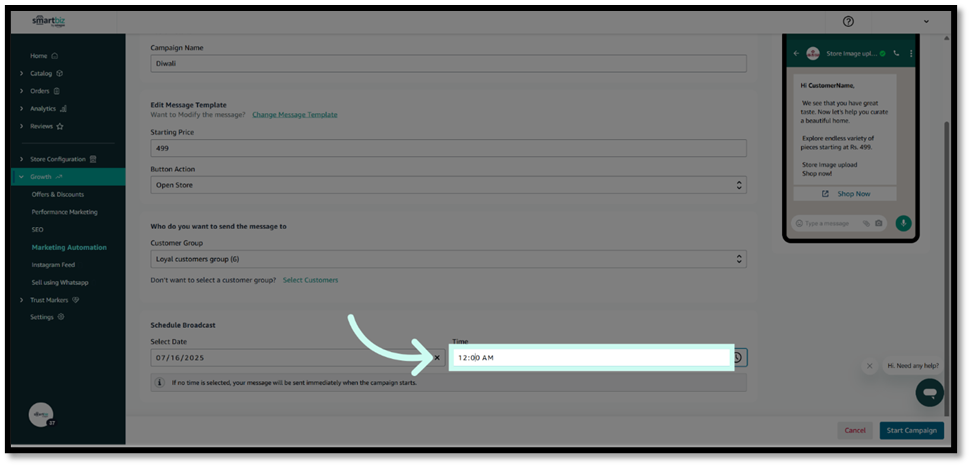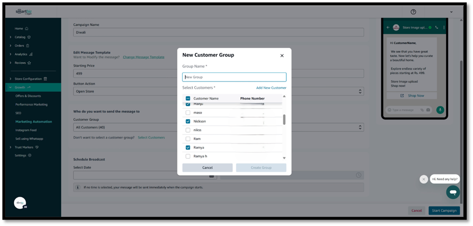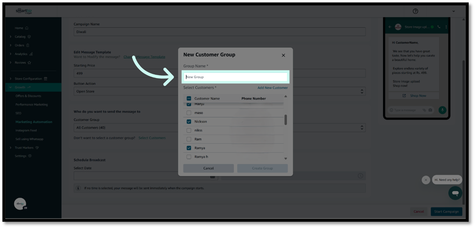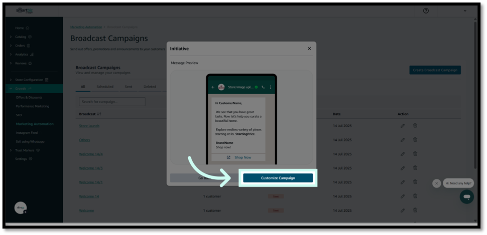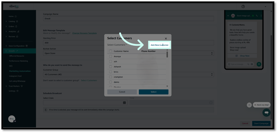 Define your marketing initiative, ensuring it aligns with your business goals and resonates with your target audience. You can choose from some pre-defined objectives such as Store launch, sending offer, announcing upcoming sale, promote a new collection etc. If required, you can create a custom objective also.