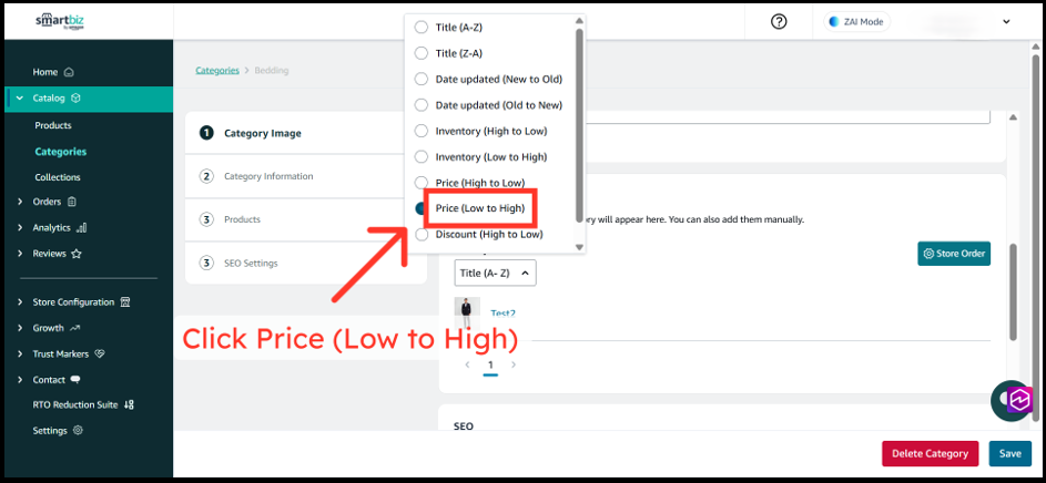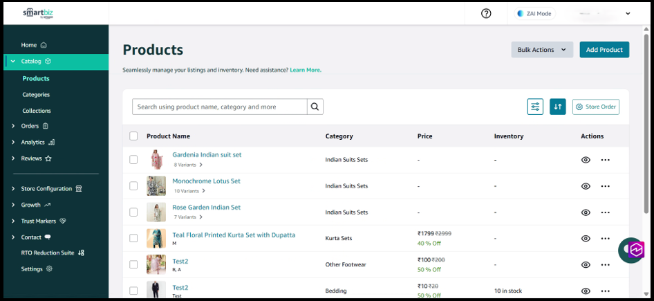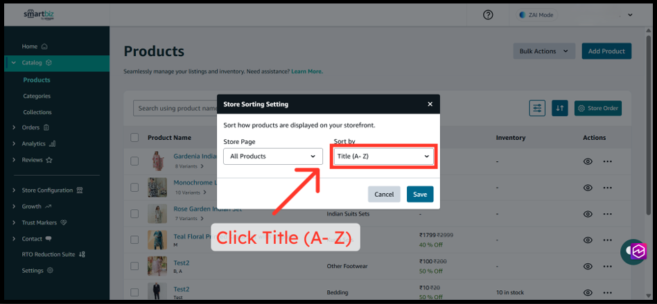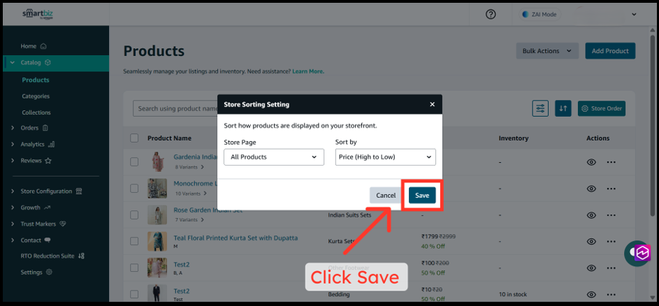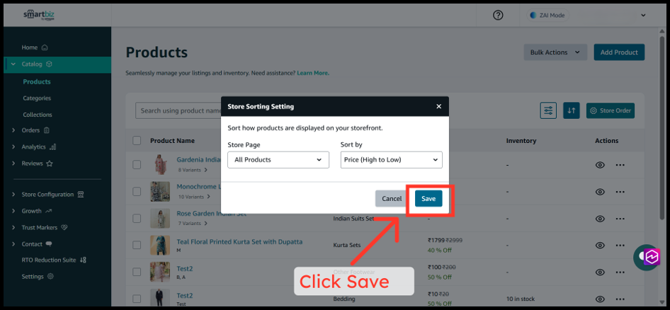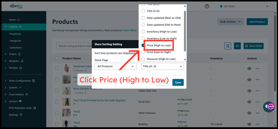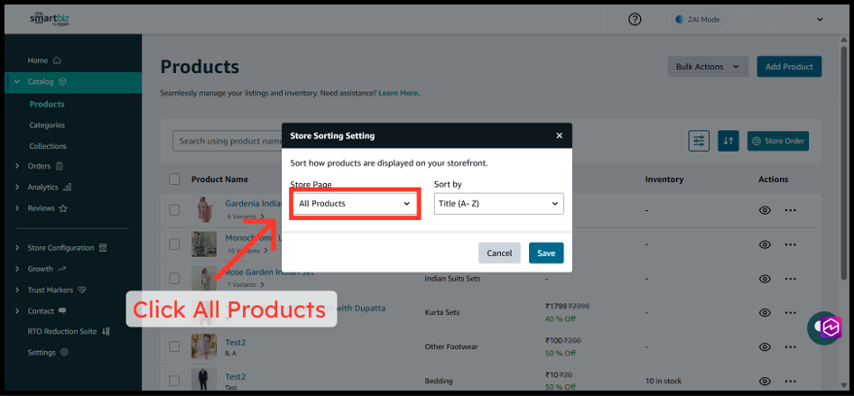 The Product Sorting feature in SmartBiz allows you to control how products appear across your entire storefront—including All Products, Categories, and Collections pages. By customizing the sort order, you can highlight your best-selling items, showcase premium products first, or organize inventory alphabetically to help customers find what they need faster. These changes apply directly to your live website at www.smartbiz.in, giving you full control over your customers' browsing experience.