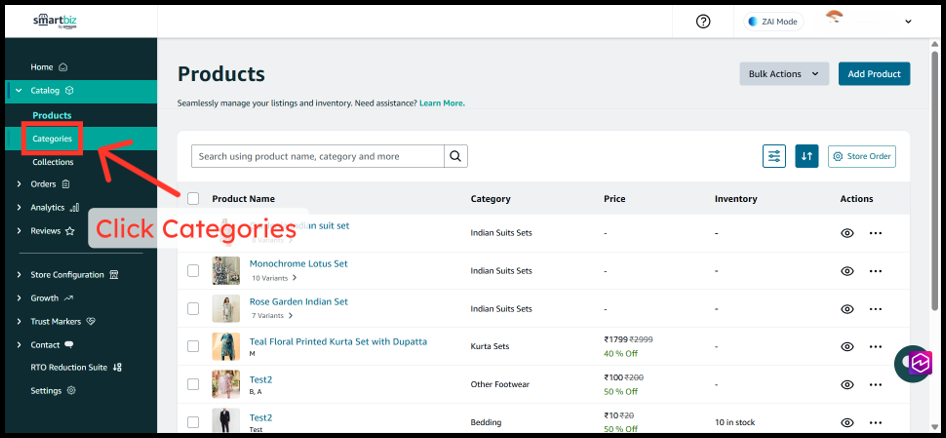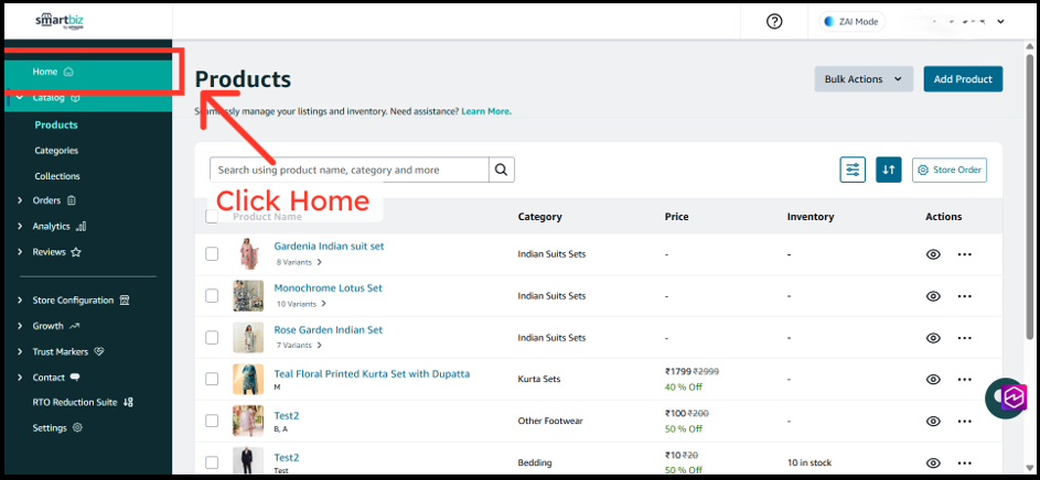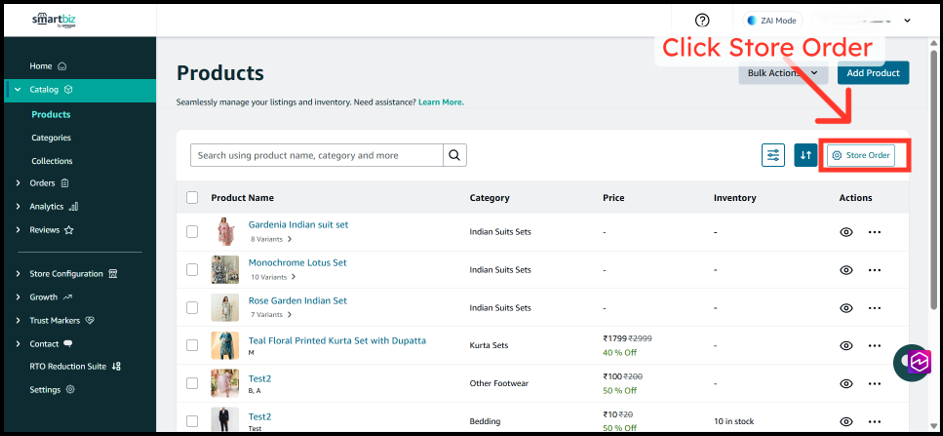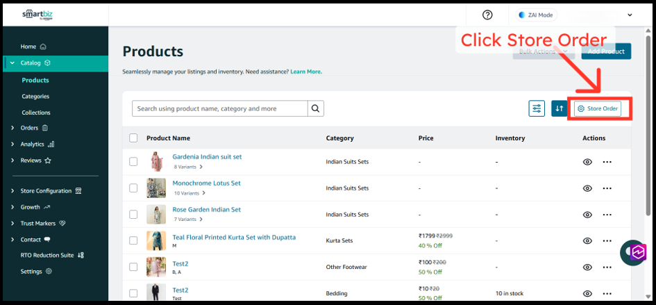 1. Log in to your SmartBiz Desktop Seller App at smartbiz.amazon.in and navigate to the All Products page by clicking on Store Order button.