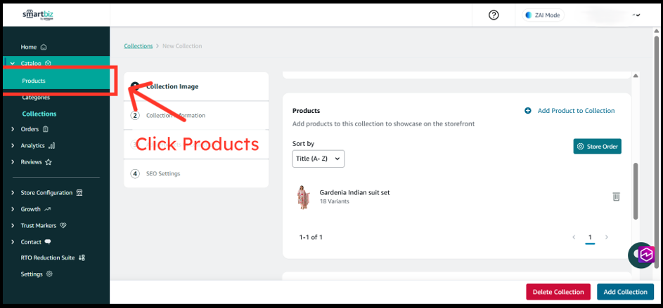 4. Navigate to the Products section within the collection and select your preferred sorting option.